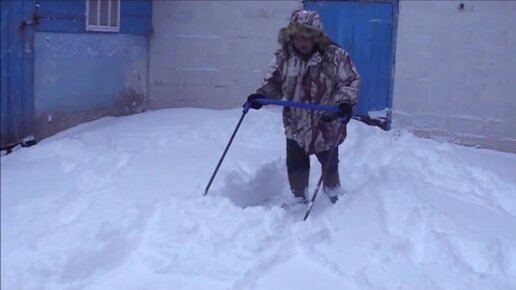 Скребок для снега на полозьях в руках 62 летнего пенсионера.