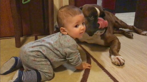 Собака и малыш. Милый боксёр со своим братишкой))