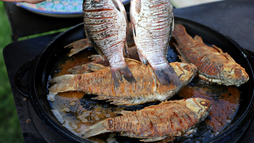ЖАРЕНЫЕ КАРАСИ БЕЗ КОСТЕЙ В СКОВОРОДЕ НА ОГНЕ