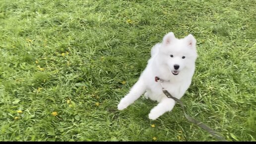 Шкодничает щенок самоед. Дождливый денёк. Как сильно промокли?