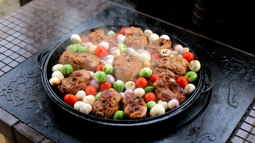 СТЕЙКИ ИНДЕЙКИ С ОВОЩАМИ В СКОВОРОДЕ НА ОГНЕ