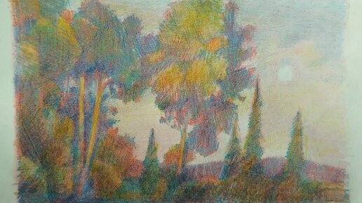 Вечерний пейзаж. Красный, синий, жёлтый.