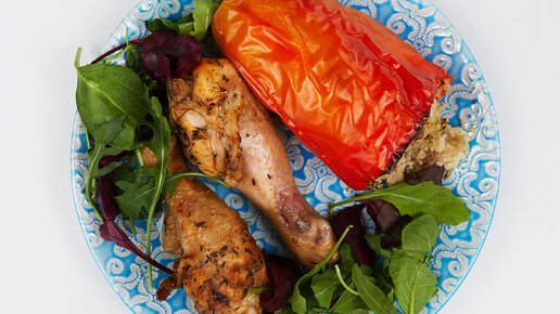 Готовлю сразу два блюда в одной форме: куриные голени с фаршированными овощами