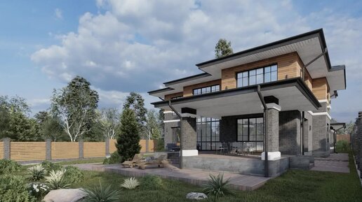 Проект двухэтажного дома в стиле Райта, дом с навесом и террасой 316 м. кв.