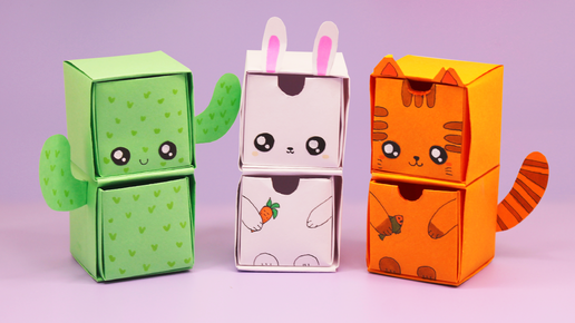 Как сделать коробочку из бумаги: Котенок, Заяц и Кактус l Оригами для начинающих