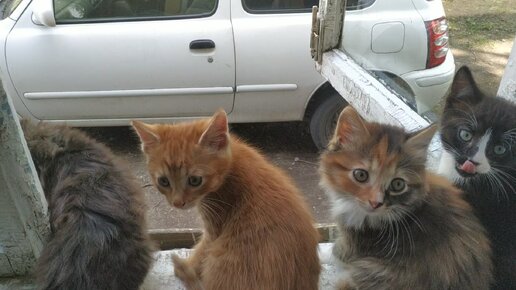 Четыре маленькие кошки сидят на окошке.