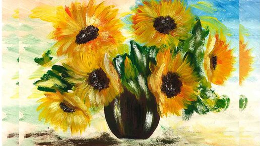 Как нарисовать подсолнухи. Как нарисовать натюрморт. Рисуем подсолнухи в вазе. Натюрморт гуашью.