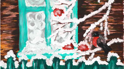 Как поэтапно нарисовать снегиря у окна дома. Зимний пейзаж гуашью.