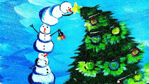 Нарисуй Новогодний пейзаж, красками гуашь. Снеговики наряжают елку, поэтапно.