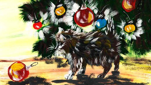 Нарисуем котенка, под новогодней елкой, гуашью. Рисуем новогоднего котенка красками, поэтапно.