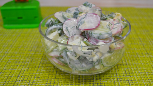 Салат с редиской, огурцом, яйцом и сметаной.Простой и быстрый салатик.
