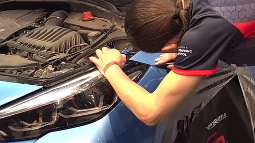 Участник чемпионата России по оклейке антигравийной пленкой бронирует крыло автомобиля