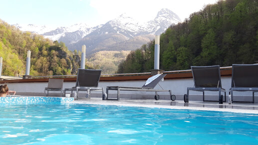 Искупались в открытом бассейне аквапарка Галактика с видом на заснеженный Кавказский хребет в Красной Поляне