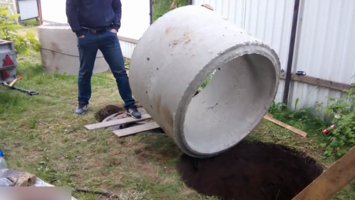 Легкий способ опустить бетонное кольцо в колодец, руки мастера в карманах, кольца сами падают в колодец
