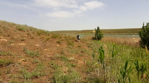 Путешествуем со щенком Дариком на авто. Очень жарко. Хотела отпустить его покупаться, вода есть, но кругом камыш - найдем ли вхо
