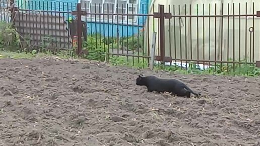 Городской кот охотится на огороде в деревне