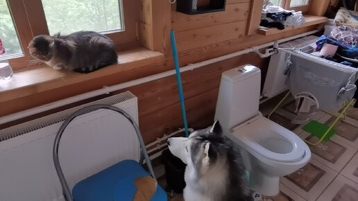 Я не понял, откуда столько кошек в доме - Главный хаски в шоке от наглости усатых.
