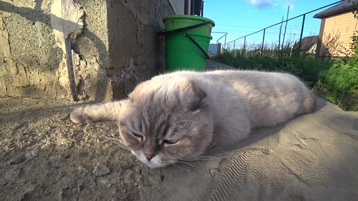 Котику Кевину уже становится жарко на улице. А еще ему показываем на огороде куда нельзя ходить