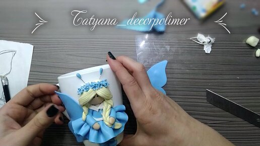 Процесс лепки куклы с крыльями на кружке из полимерной глины