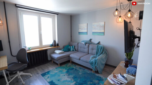 Маленькая гостиная с люстрой в углу, диваном и рабочим местом. Не темно и не тесно