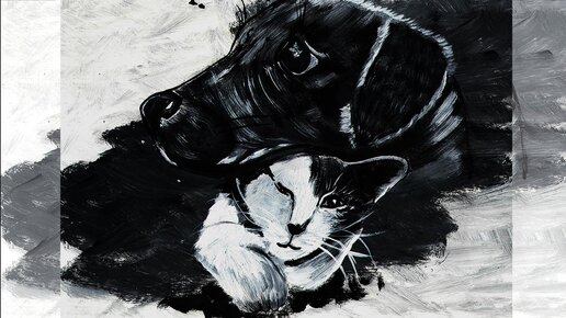 Как нарисовать собаку с кошкой. Рисуем черно белый рисунок. Рисуем гуашью.