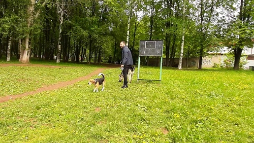 Щен Дар встретился с охотничьей собачкой. Могли бы подружиться, но не подружились. Охотник очень страшно нарычал