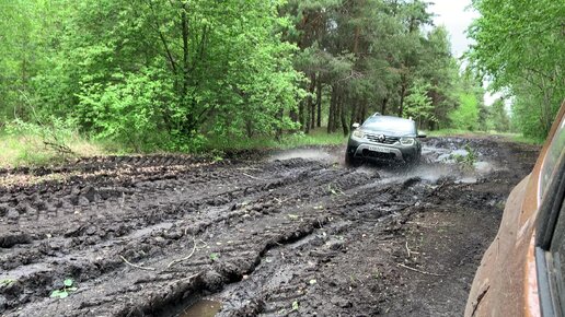 «Дастер» с вариатором скачет по лужам на лесной дороге