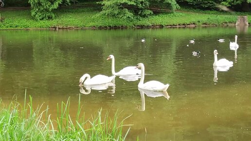 Прогулка по парку Царицыно. Белые лебеди плавают в реке Язвенка