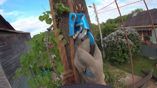 Липа начала падать и зависла на соседнем дереве пилили дерево частями привязав к стволу