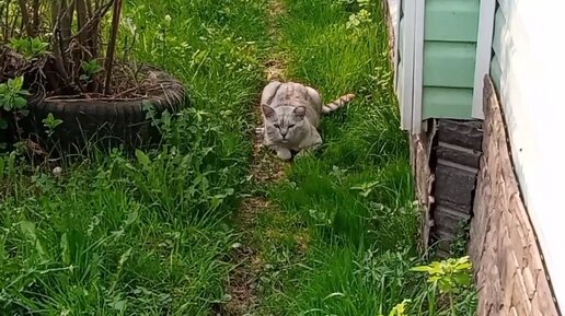 Красивый кот с полосатым хвостом, пришёл в гости к кошке.