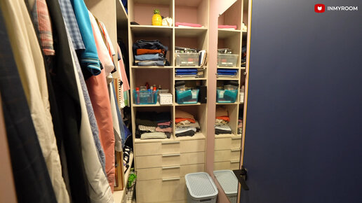 Мини-гардеробная за скрытой дверью. Отказались от надоевшей ИКЕА, и сделали текстурные полки под бетон