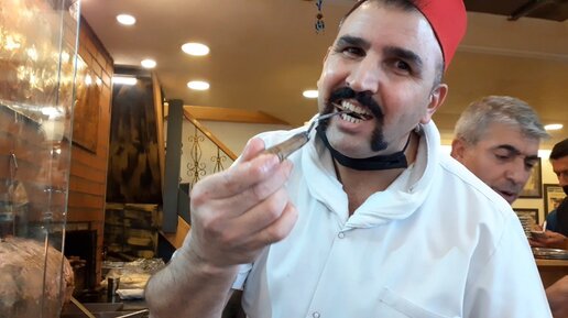 Уличная еда в Стамбуле: турок жарит знаменитый кебаб