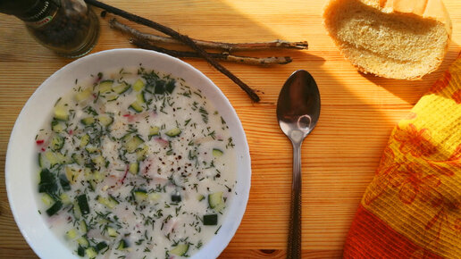 Окрошка на айране с копчёной грудинкой. Это просто шедевр, больше никакой варёной колбасы
