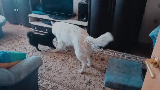 "Редкие кадры": 7-летняя белая овчарка Линда играет с игрушкой и щенком шипперке.