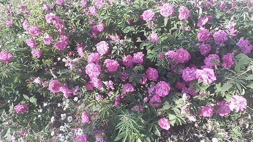 Розы, и кусты шиповника в цвету