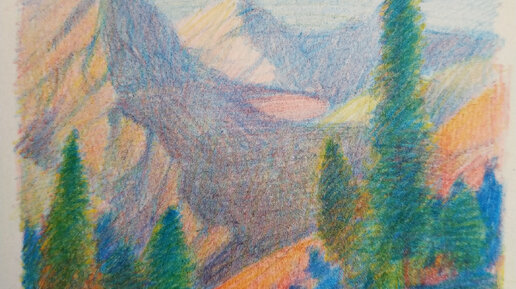 Горный пейзаж, карандашами трех цветов. Синий, красный, желтый.