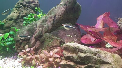 Аквариум с камнями, корягой и анубиасом - месяц после запуска