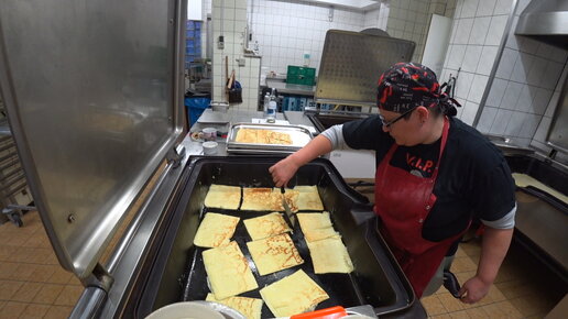Посмотрите как готовят блины для детских садов и школ. Съёмка прямо на кухне.