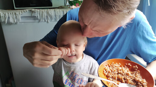 Папа помогает сыну обращаться с ложкой и ест сам.