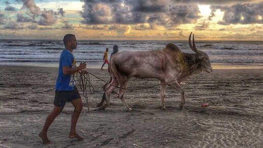 Бойцовские быки и люди тренируются вместе на закате в Гоа