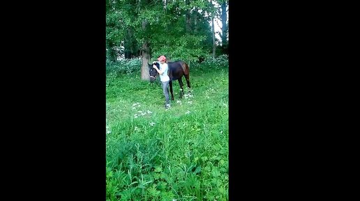 Дочь первый раз одевает уздечку на лошадь и доит козу