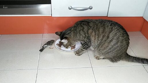 Кот очень подружился с воробьём и всегда зовет его на завтрак