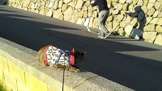 Кот гуляет по улице на поводке, как собака