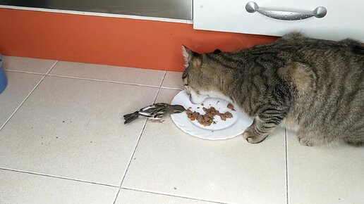Кот очень подружился с воробьём и всегда угощает его своей едой