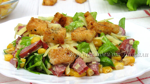 Очень вкусный Салат "Хрустик" (делюсь простым и быстрым рецептом Cалата с колбасой, сухариками и кукурузой)