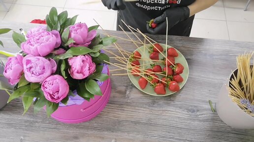 Быстрая профессиональная сборка шикарной композиции из пионов и клубники. С комментариями.