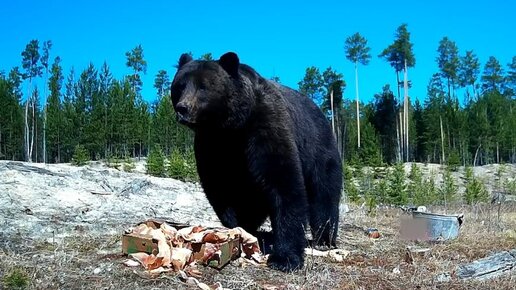 Бурый медведь с темным окрасом питается на "подкормочной площадке"