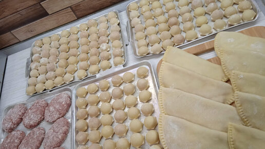 Делаю заготовки из 2 кг фарша. Получилось 3 подноса чебуреков, 12 котлет и 180 пельменей.