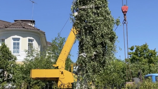 Высадка в саду огромной березы. Высоко и круто! Все листики целы!