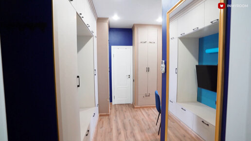 Крошечная прихожая, в которой предусмотрели все: пуф, зеркало, вешалки, шкафы, датчики дыма, кондиционер. Как все уместили?